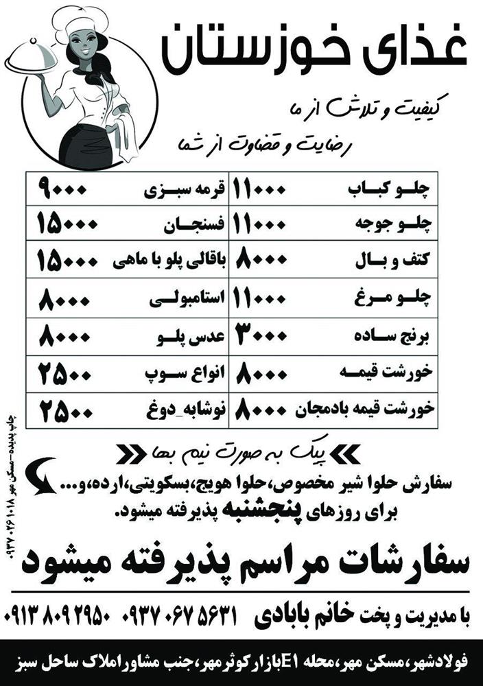 غذای خوزستان. غذای پرسنلی و سفارشات مراسم پذیرفته میشود. کباب کوبیده - کتف و بال - برنج ساده - خورشت قیمه - فسنجان - چلو مرغ - سالاد >> پیک بصورت نیم بها << - سفارات مراسم پذیرفته میشود. - سفارشات حلوا شیر مخصوص، حلوا هویج، بسکویتی، ارده، و ... برای روزهای پنج شنبه پذیرفته میشود.